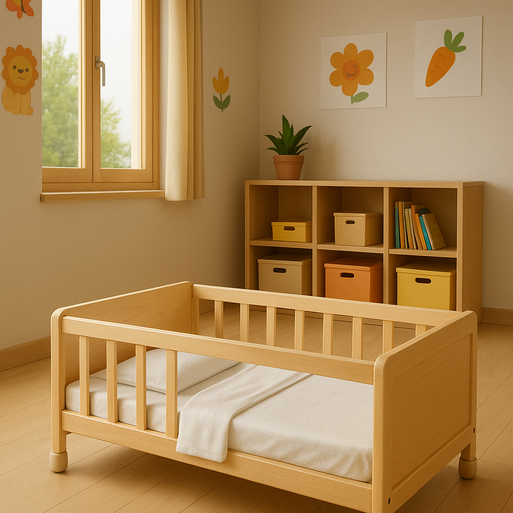 Bezpečná a pohodlná postýlka pro polední spánek – aby se děti probouzely odpočaté a spokojené. Včetně kompletního ložního vybavení.